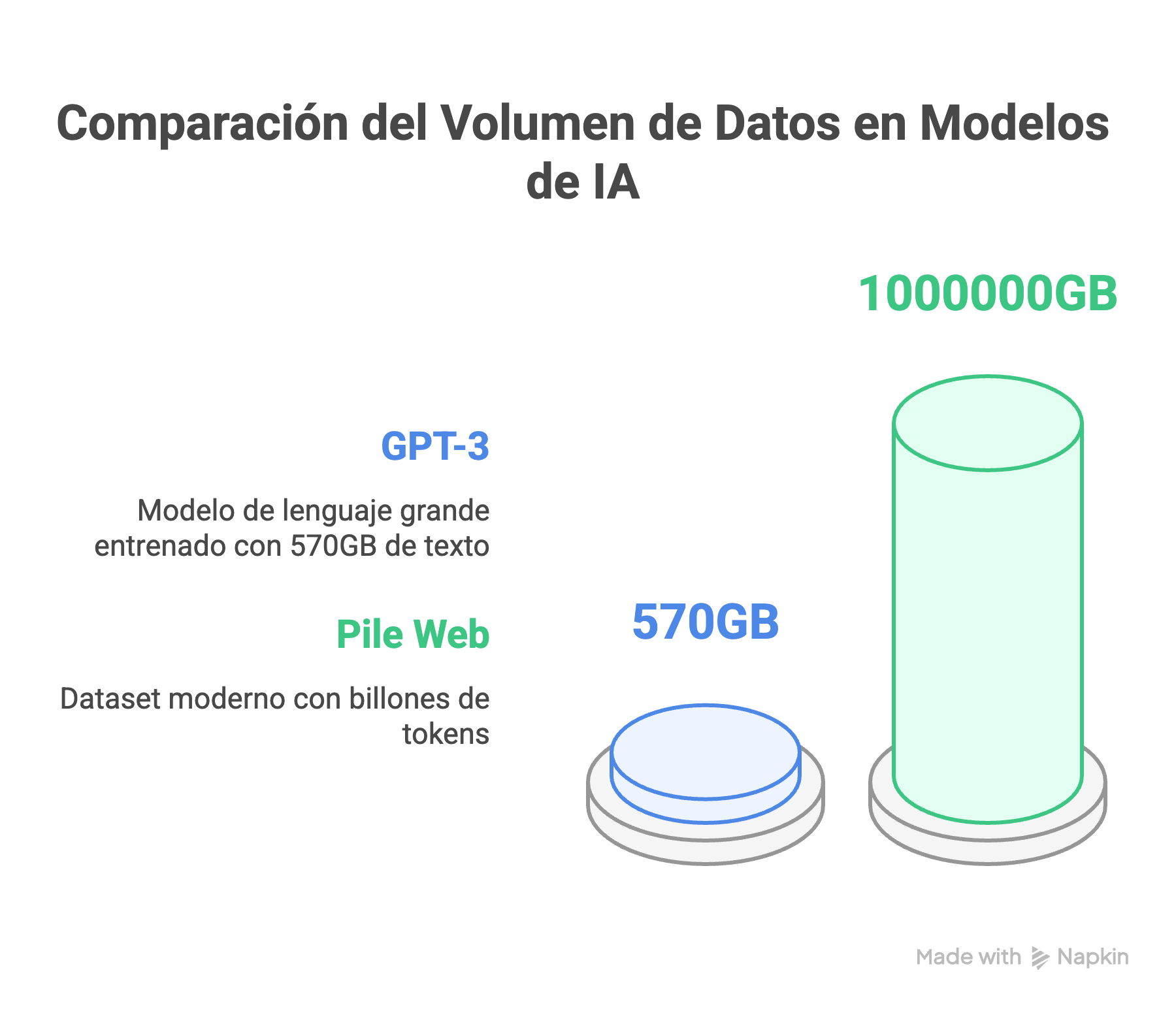 La escala de los datos de pre-entrenamiento es crucial. Por ejemplo, GPT-3 fue entrenado con aproximadamente 570GB de datos de texto, mientras que datasets modernos como Pile Web contienen billones de tokens.